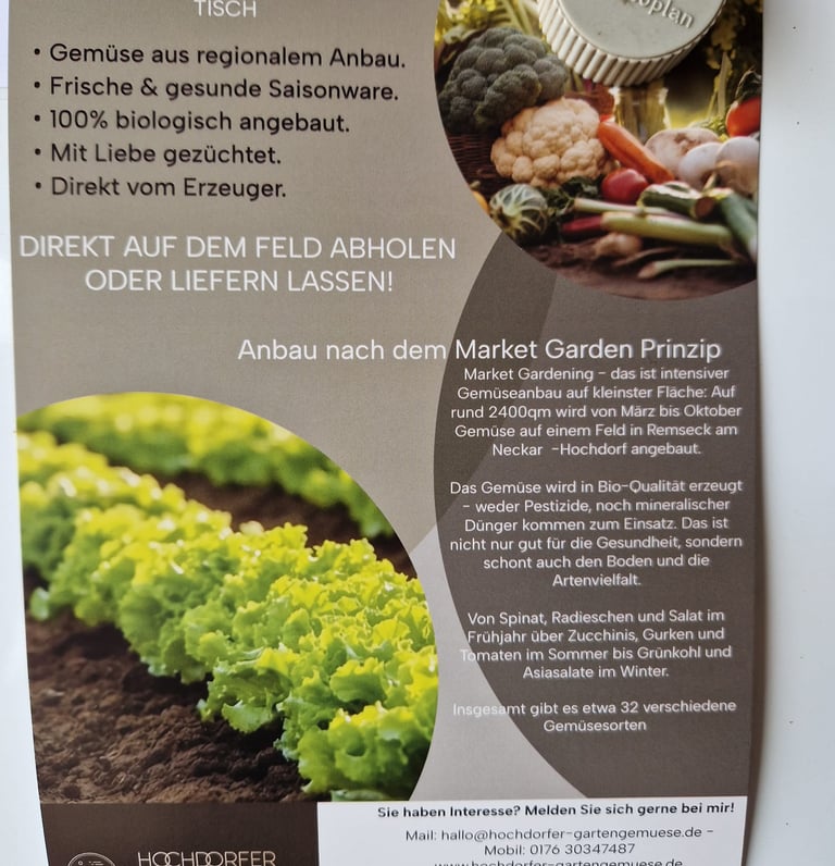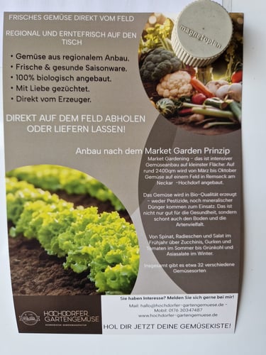 Mehrere private Haushalte abonnieren einen Gemüseanteil für eine ganze Saison – ihr erhaltet 30 Wochen lang frisches Gartengemüse.Von Spinat, Radieschen und Salat im Frühjahr über Zuchinis, Gurken und Tomaten im Sommer bis Grünkohl und Asiasalate im Winter. Insgesamt 30 verschiedene Gemüsesorten.Hochwertiges Gemüse aus nachhaltigem Anbau.